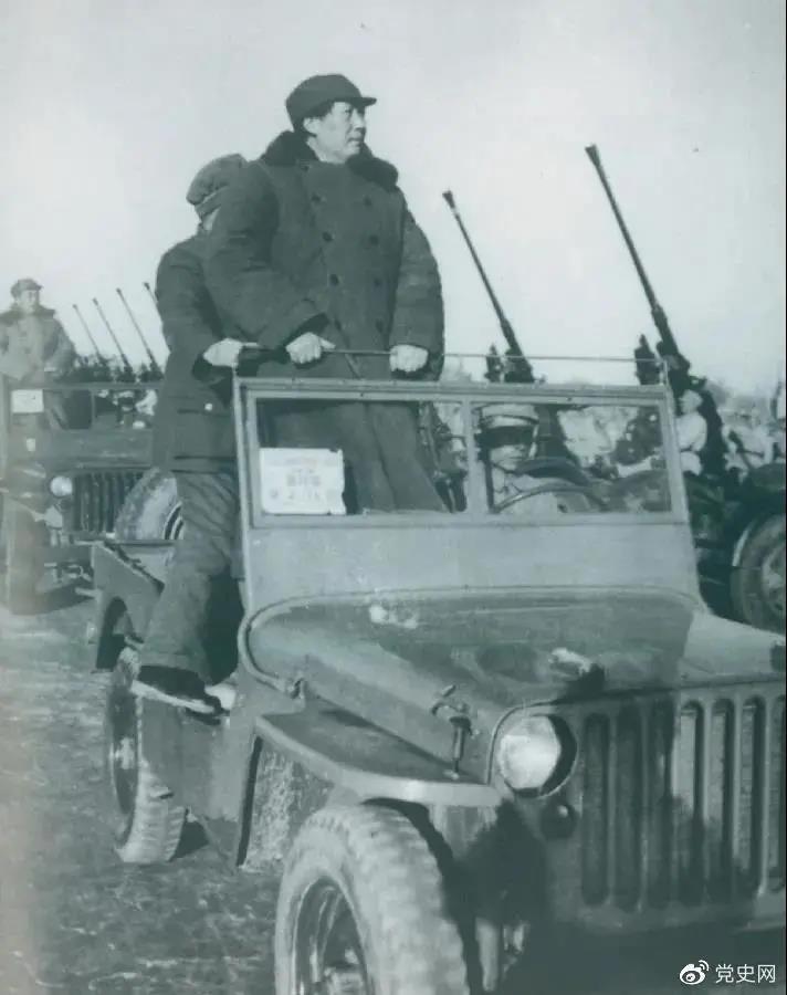 1949年3月25日,毛澤東在北平西苑機(jī)場(chǎng)檢閱部隊(duì)。