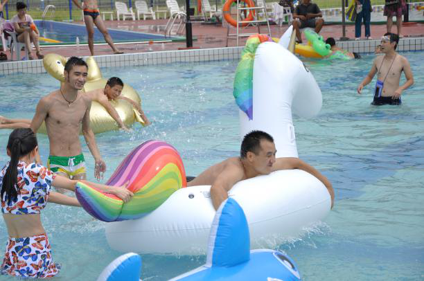 隨后,水上趣味接力賽拉開了帷幕。選手們趴在造型各異的動(dòng)物氣墊上從水上滑梯沖入水中,濺起陣陣?yán)嘶?,然后奮力將氣墊劃向下一個(gè)選手處。把氣墊當(dāng)成小船往前劃非常費(fèi)力,選手們嘗試了各種方法,有用手劃水的,有用腳蹬的,還有手腳并用的,有的還一不小心掉進(jìn)了水里,水池邊的圍觀啦啦隊(duì)們又一次忍俊不禁的開懷大笑。